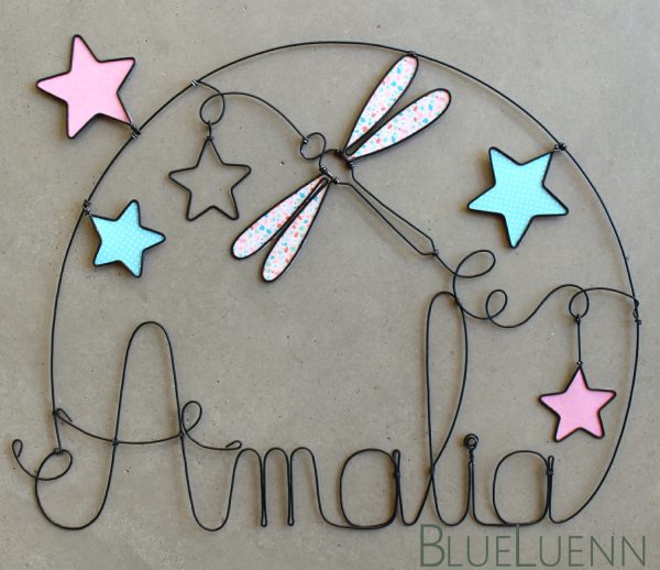 Les prénoms sont en fil de fer recuit (diamètre 1,3 à 1,4 mm) ornés d’éléments en papier imprimé.